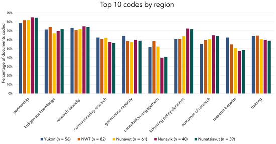 There is not a lot of variation amongst the top ten codes overall across the five regions (Figure 7). There is a slightly greater importance put on governance capacity and research benefits in documents relevant to the Yukon, on consultation engagement and Indigenous knowledge in documents relevant to NWT, and on informing policy decisions and outcomes of research in documents relevant to Nunavik and Nunatsiavut (Figure 7). We analyzed the documents related to each region separately to identify the most-used codes in each region, and seven of the top ten codes ranked consistently high in all regions, including partnership, Indigenous knowledge, research capacity, informing policy decisions, governance capacity, and communicating research. Other themes with regional importance were northern participation (Yukon, NWT, and Nunavut), and research agreements (Nunavik and Nunatsiavut).
