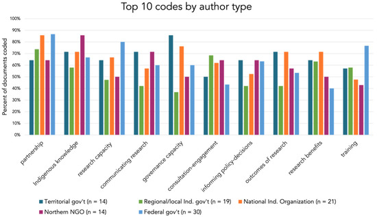 There was more variability in the thematic coding when the top ten overall codes were cross-referenced by the five most common author types (Figure 8). Indigenous knowledge and communicating research were more commonly coded in documents produced by northern NGOs (Figure 8). Many of these organizations centre Indigenous knowledge or, at the very least, emphasize its importance in their research approach. Communicating research is an important role for northern NGOs (Figure 8), many of which focus on research with communities and Indigenous northerners, often promoting participatory methodologies that require ongoing communication throughout the research project.