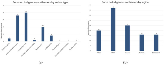 Inclusion of Indigenous northerners in document focus: (a) by author type; (b) by region.