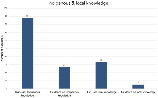 About 80% of all documents (88) included a discussion of Indigenous knowledge as a key source of understanding for northern environments and society, but only 25% (27) provided specific guidance on how to include or engage with Indigenous knowledge (Figure 11). These documents showed a wide range in their depth of discussion on Indigenous knowledge. In some cases, this is limited to a small mention of the importance of including Indigenous knowledge, while others included an in-depth discussion of Indigenous knowledge in research or guidance on how to collect Indigenous knowledge.
