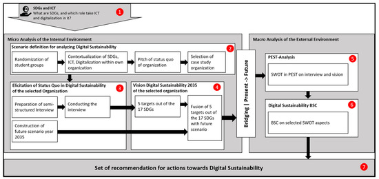 In the next phase (step two), students define the scope of their scenario which they are going to investigate and analyse during the course and assess its potentials for digital sustainability-based solutions. As all students are studying part-time, it is important to connect the respective scenario to their own professional experience and environment, as this improves comprehension of the tasks and eases the task of working on an unknown topic. To encourage students to cross-cultural barriers (in this case, differences between sectors or types of business environments, also in different countries) and improve knowledge spillover between the students, randomized groups of four are formed [48]. This also helps to spread out the heterogenous backgrounds of the students, as they tend to remain in closed study groups within the cohort, mostly within a particular discipline or working background, e.g., consultants with consultants, or security specialists with security specialists. After the formation of the groups has been completed, the students are introduced to deeper the concepts of digitalization and SDGs to tie in with the initial introduction in step one. This time, each student assesses potential connection points and application domains within their own company or organization. Guiding questions for the students comprise among others: “What are domains or areas the SDGs address, which are also relevant for your company/organisation at the moment?”, “What are new areas/domains your company/organisation is planning to focus on in the future and where are touching points to the SDGs?”, “Is your company/organisation already confronted with challenges included in the SDGs or will it be confronted in the near future?”, “Is there already a digitalisation or digital transformation agenda in place, which has touching points to the general areas of the discussed SDGs?”.
