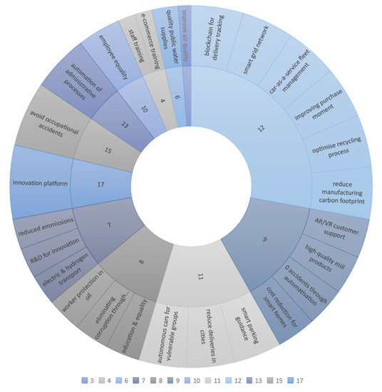 The framework presented in this paper has the goal of including the SDGs in higher and especially in continuing education. To evaluate to what extent the results of the case in which we tested the framework show the fulfilment of this objective, in this section, we present a closer look at the SDGs that have been analysed and addressed by the students. A first look at Figure 3 shows that teaching the framework succeeded in addressing a broad inclusion of varying SDGs. A total of 12 out of 17 SDGs have been addressed and the respective topics that deal with them will be shortly explained. As can be observed from Figure 3, most cases understand sustainability in a more economic sense, i.e., efficiency, and consequently address the SDGs 9 and 12. In the following, we present the context in which the SDGs have been addressed, looking at them in numerical order (according to the list of the SDGs 1-17), see also Figure 4.