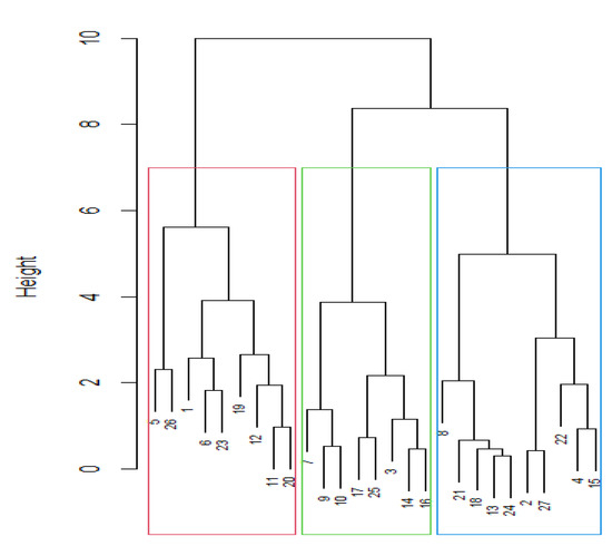 In order to further investigate the structure of the student groups, including demographic information in comparison with their project results, we conducted a hierarchical cluster analysis [54]. For the sake of this analysis, we formed a dataset, describing each of the 27 groups via the following features: their specific sector, their ISIC (International Standard Industrial Classification Economic Activities Rev.4) classification, SDG classification (EFS) [55], their age, their educational level (0-professional training; 1-A-levels), their leadership experience in years, and their overall work experience in years (Note: the demographic information is related to the student representing the company/organisation and thus the respective case-study for each group. This choice has been made as we have observed during the course that the representative served most of the time as a kind of gatekeeper for new ideas into the existing company/organisational space). For performing the actual analysis, the statistics software R [56] was used. Figure 5 shows the resulting dendrogram and the clusters contained within.