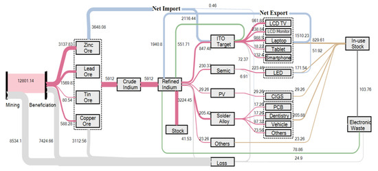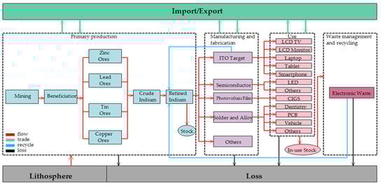 This study focuses on the flow of indium in four stages. Depending on the content of indium in the ore, the content of indium in different fields and products and the quantity of products, the flow, trade, loss, and recycling can be calculated.