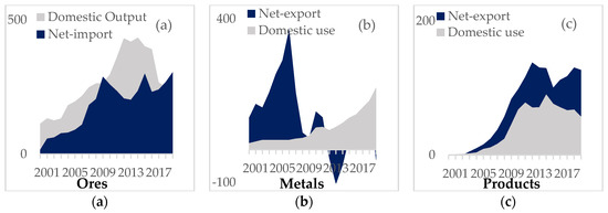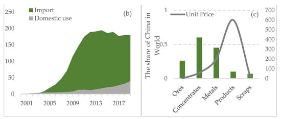 As the global demand for large-size ITO target materials increases, and China gradually breaks through the production of ITO target materials, the display industry will promote the consumption of indium in China in the future. According to the forecast of the International Energy Agency, PV will provide 16% of global electricity by 2050, and China has a 35% share of total PV electricity production [48]. The development of the PV industry will also stimulate the consumption of indium in China. Figure 3c shows the use and trade of In-containing products in China. Domestic and foreign markets show great demand for China’s indium-containing products, and the future consumption of downstream markets will continue to promote the development of China’s indium industry.