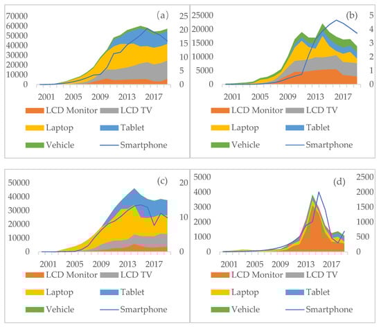 Thus, and can be used to calculate the proportion of products scrapped in years from the beginning of sales, that is, the life distribution . This study assumes that the lifecycle of LCD monitors and tablets is the same as that of LCD TVs and laptops. Therefore, their parameters are also the same. Table 2 shows the average lifespan and parameters of each type of product.