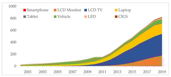 This study focuses on e-waste containing ITO films from 2000 to 2019, including LCD TVs, LCD monitors, laptops, tablets, smartphones, and vehicles. This study considers the use of indium present in other fields as unrecyclable, given that it is used in very small quantities and is difficult to recycle. For example, the recycling of PCB is mainly focused on recycling the gold, silver, copper, and palladium, while other critical metals like indium are not being recycled [34]. Although waste LEDs contain a variety of metals with potential resource value, the content is low. It is difficult and costly to recycle them directly. Moreover, China’s e-waste policies and regulations do not provide clear recycling and management regulations for waste LEDs [35].
