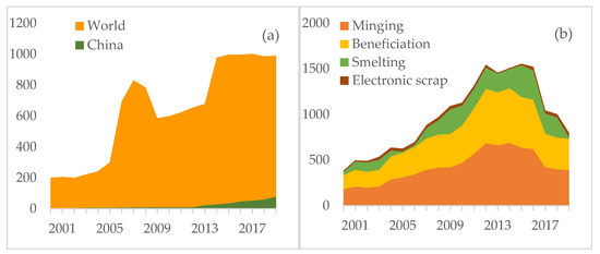 The development status and potential of China’s recycled indium (unit: t): (a) comparison of China and the world’s recycled indium output from 2000 to 2019; (b) China’s indium scrap from 2000 to 2019.