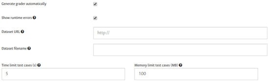 - Dataset URL and Dataset filename options are given in case the assignment requires a dataset. To set an eventual dataset for the automatic grader, there are two options: first, add the dataset URL and filename, informing the grader that a dataset must be downloaded right before each submission is executed. The second option consists of uploading the dataset directly to the task file system.