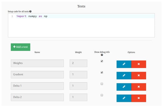 Several commercial platforms that also support Jupyter notebook automatic graders have been developed. Some of these are: Vocareum and CoCalc (https://cocalc.com, accessed on: 29 October 2021). Vocareum provides a cloud-based fully hosted solution for Jupyter notebooks with automatic grading via nbgrader. This offers test generation through a user interface, generating automated scoring and inline code feedback. This platform is quite similar to CoCalc, supporting almost the same features. As they are commercial applications, it is necessary to pay for their services. Due to this, it can be expensive to host several or large courses. In addition, another commercial platform that offers Jupyter notebook auto-grading is Coursera, whose automatic grading system supports several Massive Open Online Courses (MOOCs) within the platform, e.g., the Deep Learning Specialization (https://www.coursera.org/specializations/deep-learning, accessed on: 29 October 2021). Here, students can solve and submit assignments in a cloud-based Jupyter environment. Nevertheless, students can only see whether the test has passed or failed; it does not provide additional information like comparing answers or runtime errors.