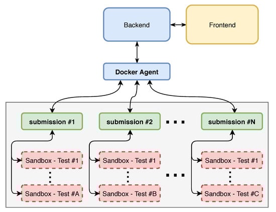 The second stage consisted of developing the environment where submissions are executed, generating the feedback and grade to be delivered to the student. When a student submits a proposal of a solution using UNCode, this submission is managed by the backend, which is in charge of managing all submissions and the corresponding submission queue. This backend sends the submission to another service called the Docker agent, which can be horizontally scaled as well. Then, this service is in charge of running the corresponding submission in a Docker container, which at the same time, runs each test in an additional docker container, acting as a sandbox to secure the student’s submission. Currently, UNCode supports several grading environments for different kinds of assignments. Additionally, various submissions can be run in parallel to speed up the response time. In this context, the development of the present work was focused on creating a new grading environment for Jupyter notebooks. Therefore, and due to its architectural design, this new grading environment can be easily plugged in to UNCode. This is illustrated in Figure 4, where the different components are shown.