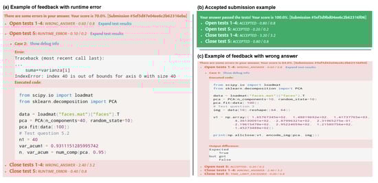 Figure 5 illustrates three different examples of feedback (summative and formative): subfigure (a) shows an example of a submission with grade 70.0% and some tests labeled as WRONG_ANSWER and RUNTIME_ERROR, corresponding to the summative feedback. One of the tests shows feedback with the details of the runtime error, where the grading code and raised exception are shown to the student (formative feedback). It is worth noting that other tests do not show additional details to the student, as the task was configured in that way. Subfigure (b) presents an example of an accepted submission, where all tests passed and the final grade is 100%. For this case, the only presented feedback is summative as all tests were correct and no further formative feedback was necessary. The subfigure (c) illustrates a submission with a grade of 64.0% and several feedback categories for each test in the submission (summative feedback). Here is also presented in more detail a test labeled as WRONG_ANSWER, where the grading code and output difference of the expected output and submission’s output is shown (formative feedback).