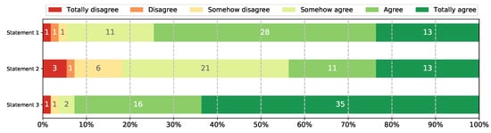 To summarize, six out of the seven categories were positive and a good number of students are in symphony with this statement. However, some respondents wrote that an automatic grader is not enough to evaluate their performance, the reason for this might be due to the dynamics and the course methodology, as the unique way to evaluate these activities was using the UNCode’s automatic grader, and therefore their only grade was given by UNCode. However, the students expressed that additional evaluation options and metrics to evaluate performance, such as proximity to the expected solution, effort and the outlined solution, among others, may be employed in the course’s methodology. That is why not many students totally agree with this statement, and more students that agree or somehow agree, as shown in Figure 8.