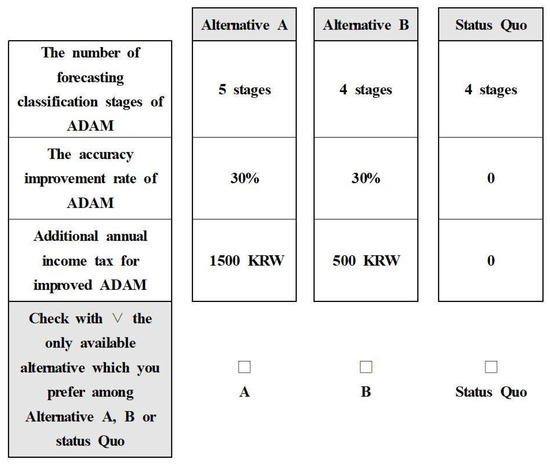 Conjoint analytical methods, including CE, were developed by Louviere et al. [25] and have been frequently applied in the fields of marketing, transportation, and psychology. Since CE was first applied to valuing a non-market good by Adamowicz [26], it has been used in various fields. The random utility maximization model is the theoretical basis of the CE approach. The model suggests that the utility of an individually chosen alternative is always bigger than the other alternatives not chosen. For this reason, this approach requires a survey of people who might be affected by research and development on ADAM.