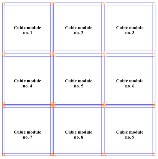 The analyzed single floor dwelling is formed by using nine cubic modules, as presented in Figure 1. A single steel unit has a length and a height equal to 3.6 m. The vertical and horizontal structural elements of the module are made from square hollow section (SHS) profiles, 180 mm in depth and width, and with a specified thickness of 12 mm (Figure 2). The structural behaviour of the cubic modules has been analyzed for different structural configurations in a study conducted at the Faculty of Civil Engineering and Building Services of Iasi [39]. The thermal performances of a structure made of steel cubic modules with similar characteristics are presented in Isopescu et al. [40].