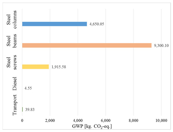 The values describing the implications for the natural environment resulting from the use of steel cubic modules for the construction of the analyzed structure are presented in Figure 4. These results show that the beams have the greatest negative influence, while the SHS steel profiles used for columns have a carbon footprint that is almost 2.5 times larger than that of the fixing elements. Compared to all the analyzed steel products, the amount of diesel and the transportation phase have an insignificant impact on the GWP parameter.