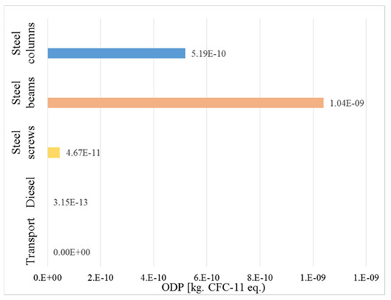 In the case of the HTPc environmental parameter (Figure 5), the steel beams have the most notable impact. The steel columns have the second greatest negative effect, followed by the impact exerted by the steel screws, the amount of diesel used, and, finally, the transportation phase. The results for the Ozone Depletion environmental indicator are presented in Figure 6. As in the case of the two previously analyzed environmental parameters, the beams have the most important impact over the stratospheric ozone layer, followed by the negative effects of the columns, screws, and the amount of diesel consumed in the transportation phase.