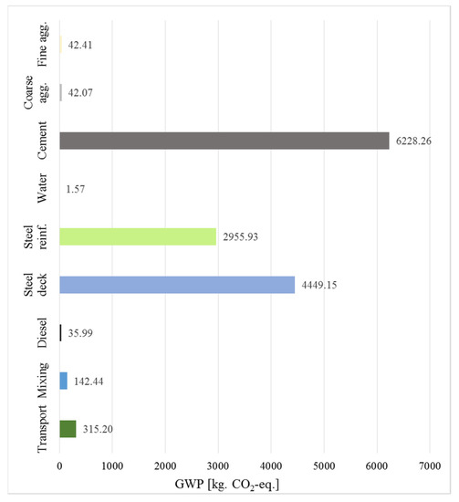 The values that describe the impact of the product under analysis over the pre-operation stage are presented in Figure 7, Figure 8 and Figure 9. The impact of the reinforced concrete slab for the GWP parameter is described in Figure 7. It can be noticed that the negative effect of cement represents approximately 84% of the combined impact of the steel deck and steel reinforcements. Additionally, the three above mentioned component materials are responsible for nearly the entire carbon footprint of the reinforced concrete slab.