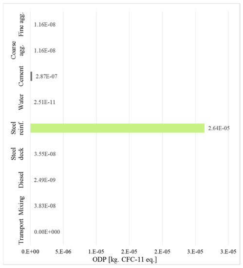 In Figure 8, it can be seen that the overall value for the HTPc parameter is highly influenced by the steel deck, this product being responsible for more than 50% of the total cancerous effects. As represented by the results, the cement, steel reinforcement, and diesel have an important impact on the overall result as well. Figure 9 presents the environmental effects of the analyzed construction product in the case of the ODP impact indicator. In this case, the amount of steel reinforcement makes up for about 99% of the overall negative impact on the stratospheric ozone layer.