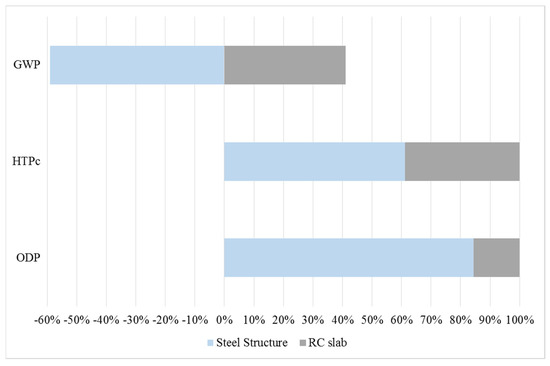 Comparing the values for the cradle-to-gate evaluation (Table 6), it can be ascertained that the steel cubic modules have the most important effect on the total environmental footprint for the two considered environmental parameters. The steel structural elements account for about 53% of the overall carbon footprint and for approximately 62% of the total impact on human health. At the same time, the RC slab exerts 94% of the overall negative influence on the environment in the ODP category.