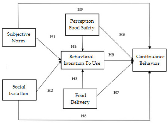 As more value is placed on quality of life and well-being, public concerns about food safety have become more prominent [59]. Especially in the COVID-19 outbreak context, people have found food safety concerns to be of paramount importance, as it affects the intention to consume products through food delivery apps [60]. Moreover, food safety risk perceptions have been researched in a number of countries [61]. Sim et al. [61] found that when consumers perceived a food safety risk, they frequently employed buying strategies to mitigate risk, such as stopping or reducing purchases of the offending product. Moreover, Al Amin et al. [7] showed that perceptions related to food safety concerns positively influenced behavioral intention towards use during the COVID-19 pandemic. In particular, customers have become more concerned about food safety, with an emphasis on the manufacturing process, food processing quality, and food additives [44]. Asian perceptions of safety concerns, especially in Vietnam, were quite different from those of Western people, in which food safety inspections decreased and food safety violations increased [62]. However, Wessells and Anderson [63] argued that food consumption might be reduced due to the customer’s perceived food safety concerns. Additionally, Al Amin [7] found for the relationship between food safety and continued behavior. If customers perceived food delivery apps’ service as safe, they were more likely to purchase foods. As a result, the author proposed the following hypothesis.