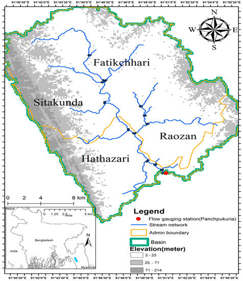 The integration of the Soil and Water Assessment Tool (SWAT) with land-use simulation models [19,20,21] provides an approach to assessing the impact of alternative land-use and land cover (LULC) scenarios on hydrology [22]. Furthermore, SWAT has demonstrated its capability in different parts of the world to assess the impacts of land-use changes (e.g., [23,24]), climate change (e.g., [25,26]), or both simultaneously (e.g., [27,28,29,30]). However, in Bangladesh, little work has been undertaken on using hydrological models to develop management plans for river basins. Spanning almost 570 km2, the Halda Basin (Figure 1) is one of the most important river basins in Chittagong, a major coastal hub in southeastern Bangladesh, and a key source of drinking water for the surrounding region. The basin is also an ecologically sensitive area that is the primary spawning ground for Indian major carps [31]. However, the Halda Basin has undergone rapid deterioration of water quality and aquatic life. During the last three decades, the southern region of this basin has experienced a significant increase in total precipitation, the total number of rain days, and maximum daily temperature [32]. Additionally, the catchment hydrology of this region is being impacted through different human interventions [33].