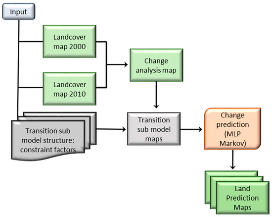 In LCM, the usual constraints that alter LULC include existing built-up areas, water bodies, road networks, etc. Here, we considered slope, distance to roads and railways, and population growth as potential drivers of any changes for the transition sub-model. Next, the change prediction model forecasted the allocation of land cover for each of the future periods. This approach is summarized in the flow chart in Figure 2.