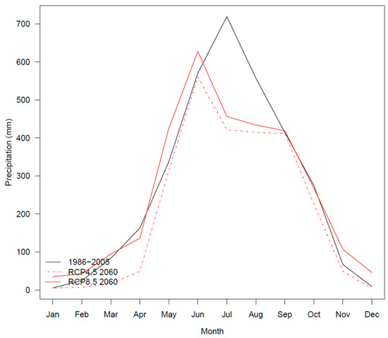 Averaged across the five RCMs, annual precipitation for both RCP scenarios is projected to decrease ~231 mm from the baseline (269 mm). However, there is some variability in projections for the monsoon period (Figure 3). Future declines in precipitation were also reported by [49], who used RCMs to produce high-resolution climate data for evaluating climate effects in the Ganges-Brahmaputra-Meghna (GBM).