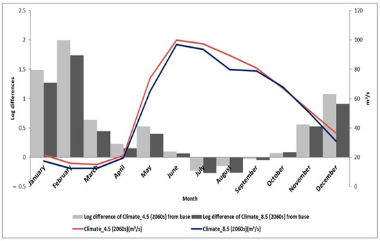 Projected changes in monthly streamflow under RCP 4.5 and 8.5 climate scenarios for the decade 2060–2069. Logarithmic differences represent the change from the baseline (1986–2005).