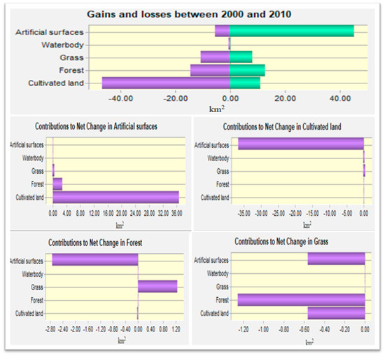 During the period from 2000–2010, substantial changes in LULC took place across the Halda Basin. Generally, the trend was the conversion of grassland to forest and of grassland and cultivated land to settlement or artificial surfaces and forest (Figure 6). The changes were mainly caused by government reforestation policy, which led to spatial shifts in forests (with little overall increase in area) and decreases in grassland and cultivated land. The key changes were mostly found in the transition of cultivated land and grassland to artificial surfaces, which increased from 64.5 km2 in 2000 to 106.0 km2 in 2010.