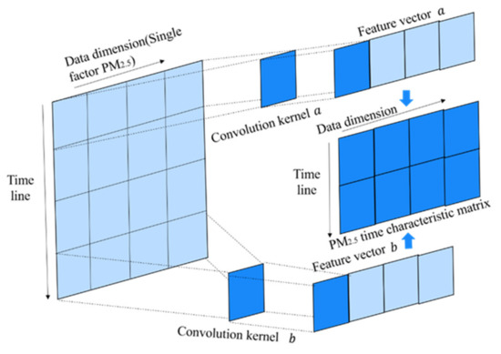 Convolutional neural network has been successfully applied to image recognition direction, which verifies that the network has a strong extraction of feature map. Based on the analysis of the data set, it is found that the characteristics of the data are multi features, shown in the form of numerical value, rather than in the form of feature map. Therefore, this study preprocesses the data, combines the characteristics of the data into a feature map, and inputs it to the convolution neural network to complete the extraction of the spatial and temporal characteristics of the air pollutant concentration data and meteorological factors [35]. The spatiotemporal feature extraction of single factor PM2.5 is shown in Figure 1. Among them, the feature map is traversed from left to right on the data feature axis through a one-dimensional multi-scale convolution kernel to complete the convolution operation, the number of steps is 1, and the feature vectors output by different convolution kernels are spliced and fused to obtain a single factor. The spatial characteristics of the relationship. On the time axis, as the convolution kernel traverses from top to bottom to complete the convolution operation, the number of steps is 1, and the local trend of the single factor changing over time can be obtained. Finally, the spliced and fused feature vectors are merged in the data feature direction, and the spatio-temporal features of multi-site PM2.5 are output.