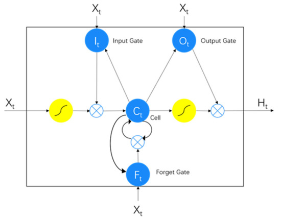 Long Short-Term Memory (LSTM) is an improvement of Recurrent Neural Network (RNN) [36]. RNN has a higher probability of gradient disappearance and gradient explosion during training, and there is a long-term dependence problem. LSTM can effectively solve this problem. LSTM introduces a gate mechanism, which makes LSTM have a longer-term memory than RNN and can be more effective in learning. In LSTM, each neuron is equivalent to a memory cell (cell, ). LSTM controls the state of the memory cell through a “gate” mechanism, thereby increasing or deleting the information in it. The structure of LSTM is shown in Figure 3.