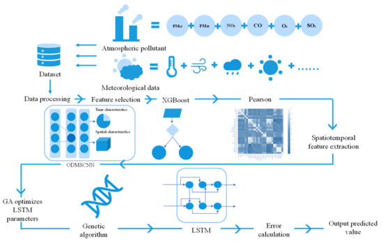 In this study, the PM2.5 feature selection based on XGBoost, combined with MSCNN to extract temporal and spatial features, and GA optimized LSTM, were used to establish the XGBoost-MSCGL air pollutant concentration prediction model. Compared with other machine learning, feature selection combined with feature extraction and combined with deep learning is an effective method for processing big data (especially spatio-temporal feature data). Combining spatio-temporal feature and models can improve the performance of spatio-temporal data prediction to a certain extent. In different cities, the importance of PM 2.5 influencing factors are different. It is necessary to select PM2.5 influencing factors in different cities and propose redundant features and delete redundant features in order to avoid influencing the accuracy of the prediction model. The prediction method proposed in this paper is feasible for the PM2.5 h concentration data prediction in multiple cities, and the method can be used in multiple regions and predictions on different atmospheric pollutant concentration. In terms of input variables, regular monitoring data from the National Environmental Monitoring Station, and China Meteorological Administration are used. In terms of modeling methods, machine learning and deep learning algorithms are combined. On the premise of eliminating redundant features, space and time features are considered, and a genetic algorithm is used to optimize the parameters of the LSTM network, enabling it to capture optimal parameters better. With stronger capturing ability, the long-term dependence relationship hidden by air quality data is more accurate, and the prediction accuracy is further improved.