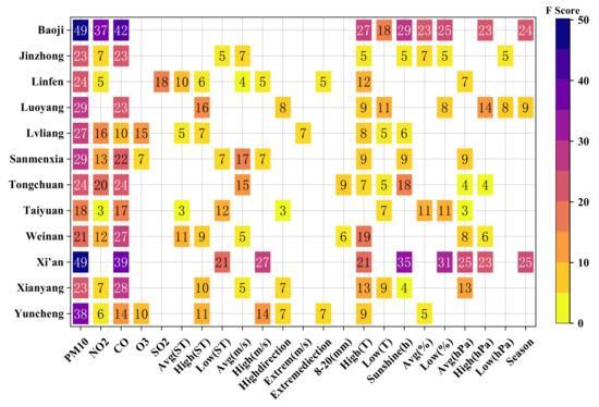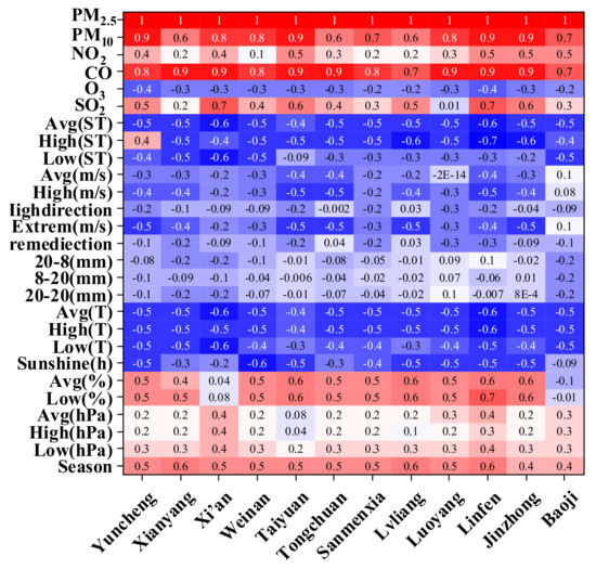 Meteorological elements affect air quality by affecting the accumulation, diffusion, and elimination of pollutants. In the studies of PM2.5 and PM10 concentration, they are found closely related to meteorological elements (such as temperature, precipitation, wind speed, etc.). According to existing studies, relative humidity has an important a key factor to fine particle concentration [38]. At higher relative humidity, pollutants are attached to the surface of water vapor easier. Water solution is a good place for chemical reaction [39]. Wind direction and speed affect the dispersion of particulate matter in the air [40]. Chen et al. made predictions on PM2.5 concentration in Zhejiang Province, finding that meteorological factors such as air temperature, air pressure, evaporation, humidity are remarkably correlated with PM2.5 concentration [41]. Zhang Zhifei et al. found that O3 h mass concentration has positive correlation with air temperature, solar radiation, visibility and wind speed, whereas NO2 concentration is positively correlated with relative humidity and atmospheric pressure [42]. Precipitation [43], season [44], precipitation [45], sunshine duration [46], and other factors have remarkable impacts on the concentrations of air pollutants. Different city characteristics will also have different impacts on PM2.5, the correlation coefficient of PM10 and CO in Jinzhong and Linfen is 0.9. Further, the two numbers in Lv Liang are 0.6 and 0.7. The correlation coefficients of 12 cities show that temperature, surface temperature, atmospheric pressure, air humidity, and sunshine duration all affect PM2.5. Further analysis is needed in selecting appropriate features for the model.