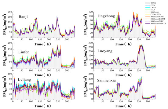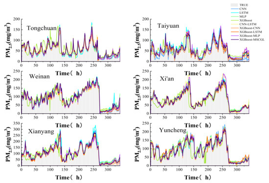 Predicted and Measured PM2.5 h Concentration Values of Nine Models in Six Cities: Tongchuan, Taiyuan, Weinan, Xi’an, Xianyang, and Yuncheng.