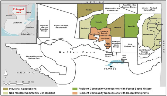 The Maya Biosphere Reserve in Petén, Guatemala, demarcating forest use concessions of the multiuse zone (courtesy of Radachowsky et al. [15]).