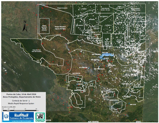 Like many tropical forest landscapes in Central America, Guatemala’s northernmost department of Petén is highly susceptible to forest fires. While Petén comprises approximately a third of Guatemala’s national territory, encompassing 13 municipalities and more than 800 communities, between 1998 and 2009, the region accounted for 58% of the surface area in Guatemala affected by fire [1]. Petén is also home to the Maya Biosphere Reserve (MBR), which contains more than 25,000 sq. km of protected areas with extensive historical, archaeological, biodiversity, recreational, and scenic value [2]. In recent decades, population growth and a corresponding increase in deforestation have compounded the forest fire risk to the natural resource base, ecosystems, and cultural patrimony of the region as a whole and of the MBR in particular [3].