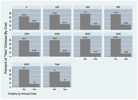 The choice experiment was sent to 85 respondents in 2016, resulting in 2550 complete observations. Because the utility function is probabilistic, limited dependent variable estimation techniques are necessary to estimate the econometric model. We used a conditional logit model to predict the probability of a respondent choosing a particular option. We estimated the conditional logit using the maximum likelihood. We included all the attributes as explanatory variables. We also included an alternative specific constant (status quo) variable. Status quo is the alternative specific constant, with a mean of 0.37, indicating that 37% of the choice sets resulted in the “status quo” option being preferred (Table 4). Our results generally conform to the law of demand. As the cost increased, the percentage of “yes” choices decreased, with the exception of the highest price point (Figure 4).
