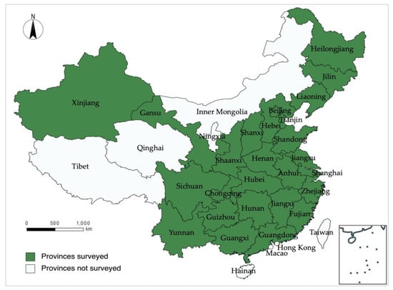 CFPS is a nationally representative, biannual longitudinal survey of Chinese communities, families, and individuals launched in 2010 by the Institute of Social Science Survey of Peking University, China []. The CFPS is designed to collect individual-level, family-level, and community-level longitudinal data in contemporary China. The studies focus on Chinese residents’ economic and non-economic well-being and a wide range of research topics, including economic activities, education outcomes, family relationships and dynamics, population migration, and health. The CFPS sample covers 25 provinces, municipalities, and autonomous regions, with a target sample size of 16,000 households, and all members of the sample households are included in the survey. The studies have published six batches of data, including 2010, 2011, 2012, 2014, 2016, and 2018. This study adopts the data in 2014 and 2018 as research samples for two reasons. Firstly, the period is long enough to observe the impact of the household cooking fuel switching on women’s health status. Secondly, using recent data helps obtain timely and effective conclusions, which are the basis for practical policy recommendations. After deleting some samples due to severe data missing, this study contains 5180 samples from 25 Chinese provinces in 2014 and 2018 (see Figure 1).