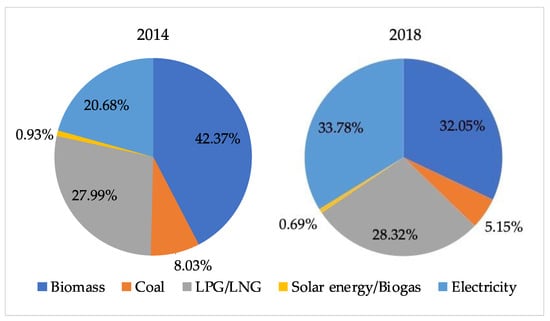 The structure of household cooking fuels in 2014 and 2018.