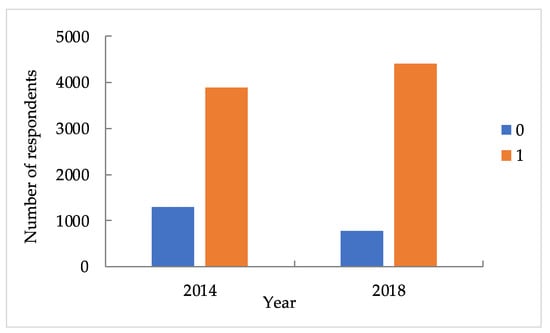 The proportions of different fuels for household cooking have changed significantly from 2014 to 2018 (see Figure 2). Specifically, the share of households using biomass and coal decreased from 42.37 and 8.03 to 32.05 and 5.15%, respectively, implying that households relying on solid fuels decreased from 50.40 to 37.20%. In contrast, remarkable growth has been witnessed in the share of households using non-solid fuels. The share of rural households using LPG/LNG and electricity increased from 27.99 and 20.68 to 28.32 and 33.78%, respectively, which indicates that the share of households adopting non-solid fuels increased from 48.67 to 62.10%. Under the pressure of environmental protection and sustainable development, energy transition towards cleaner and more efficient fuels have been proposed by the Chinese government as an integrated component of a clean energy strategy []. Overall, the cleanliness of household cooking fuel has been improved in China. This finding is consistent with some empirical results [,] that Chinese rural households rely heavily on solid fuels for cooking, but the proportion of clean fuels has been improved.