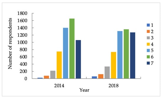 The number of respondents with different others-rated scores (1–7, the higher, the healthier) in 2014 and 2018.