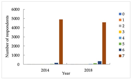 The number of respondents with different IADL scores in 2014 and 2018 is displayed in Figure 5. The number of respondents with IADL scores of 0, 1, 2, 3, 4, 5, and 6 increased from 5, 14, 11, 11, 28, 54, and 156 in 2014 to 10, 30, 22, 26, 42, 129, and 344 in 2018, while the number of respondents with IADL scores of 7 decreased from 4901 to 4577. Moreover, the overall health status of the sample declined in the investigation period.