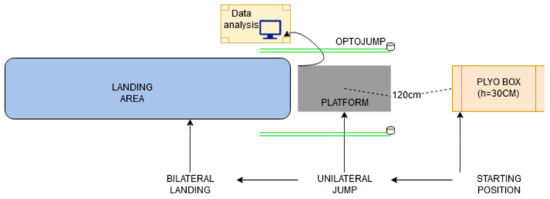 23]. The starting position is 120 cm from the middle of the platform. The participant is in a diagonal starting position in which the swinging leg is forward. A jump on the platform and a unilateral take-off in the distance are performed, followed by a bilateral landing on the mat (