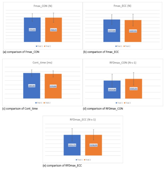 In the variable FmaxCON, the highest correlation between the observed measurements was noticed (ICC = 0.89). Moreover, good reliability (ICC = 0.86) was obtained in the variables Fmax_ECC and RFDmax_ECC. The correlation coefficient for the RFDmax_CON variable is 0.80. Of all the observed parameters, the smallest correlation between the two measurements was obtained in the Cont_time variable (ICC = 0.76). Greatest percentage of change between measurements (9.84%) was determined in RFDmax_CON.