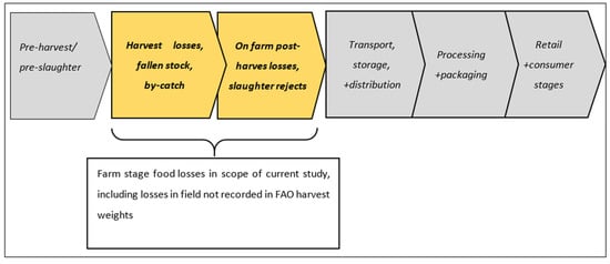 Food waste is defined from the point at which outputs from primary production can be regarded as ‘food’ based on the intended use. It does not include losses from animal or plant products produced for non-food purposes, such as industrial uses, feed and seed production. For crops and produce, this is defined in terms of crop maturity and being ‘ready for harvest’ [7]. For livestock and fisheries, a similar definitional principle is applied by the FLW Protocol (i.e., based on maturity, slaughter weight or when wild caught animals/fish are harvested) but is more problematic to interpret in practice. In reviewing datasets for this research, it was noted that fallen stock or poultry ‘dead on arrival’ at slaughter may be recorded by studies, but the question of animal ‘maturity’ and whether the loss would count as ‘food’ remains largely theoretical. Farm-stage research into food losses is rarely designed with definitional frameworks in mind, and most of the available studies identified by the research were conducted before FLW Protocol definitional rules were established in 2016.