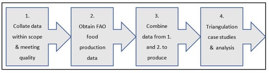 - Human food supply allocation factor to determine the part of agricultural production that is allocated for human consumption. These factors were derived from the technical report relating to the 2011 FAO study [13], with each region allocated a different factor, which were applied to estimate the total production kept within the human-food supply chain (i.e., excluding quantities sent to animal feed or other non-food uses, such as bioethanol production).