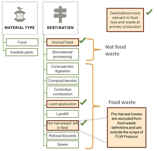 Food waste definitions under FLW Protocol indicating destinations most relevant to primary production (adapted from [12]).
