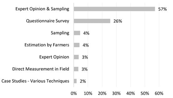 A range of different primary-data collection methods were apparent in the selected data sources (Figure 4). Most involved mixed methods of measurement (e.g., 57% used both in-country expert opinion and an element of sample surveys), with heavy reliance on surveys combining interviews and questionnaires. Due to the expense of conducting on-farm measurements, only 3% of datapoints were based solely on this technique. Methodology has important implications for the consistency and reliability of loss estimates, with self-declared losses generally under-reporting food waste compared with data obtained from direct measurement in the field [5].
