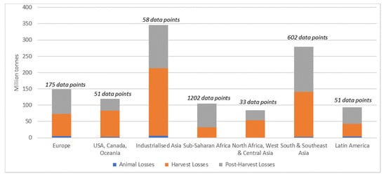 Food losses by stage and region (million tonnes) and indication of number of available data points.